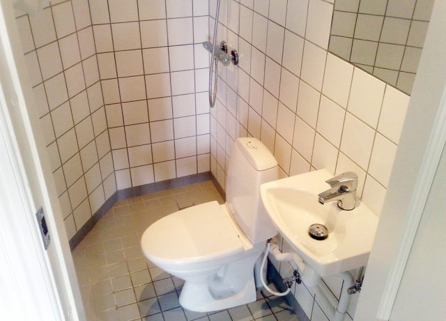 Flisebadeværelse har varme i gulvet, halogenspots i loftet og udsuget er tilsluttet til centralsuget. I skillerumsvæggen har vi isat en rude for at lejligheden skal være så lys som mulig.